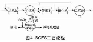 在該工藝流程中,硝化后的污水與充分放磷后的聚磷菌在Dephanox池中混合,聚磷菌進行反硝化吸磷。由于脫氮與除磷過程不再競爭VFA,當采用Dephanox工藝時,即使SBOD5/TP很低,也可能不再需要外加碳源。BCFS工藝的流程如圖4所示。