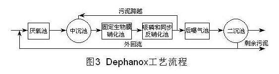 AO生物除磷的基礎是:聚磷菌在厭氧狀態下釋放磷,在好氧狀態下大量吸收磷。在實際的A2O系統中,發現混合液中磷的濃度經缺氧區之后降低了50%以上。這說明,聚磷菌在缺氧狀態下亦能大量吸收磷。后來的一系列實驗也證明,聚磷菌在分解有機物,為大量吸收磷獲取能量的過程中,更易以NO3-為最終電子受體。即聚磷菌在缺氧狀態下的吸磷速率要高于好氧狀態下的吸磷速率,亦即聚磷菌也能進行反硝化。雖然這一現象的原因尚不清楚,但已經出現基于這一現象的兩種最新脫氮除磷工藝:Dephanox工藝和BCFS工藝。De Phanox工藝的流程如圖3。