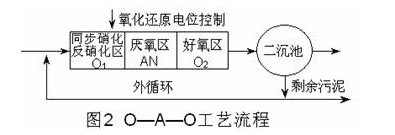 NdeN工藝在達到同樣的脫氮效率時,需要的水力停留時間較AO脫氮工藝短,因而可節省投資。Orbalsim Pre工藝是Enviro公司將同步硝化反硝化原理在ORBAL氧化溝上的應用,屬前置同步硝化反硝化的OrbalRBAL氧化溝。Orbalsim Pre一般分三溝串聯,第一溝進行同步硝化反硝化,第二、三溝進行硝化。OAO是日本應用同步硝化反硝化開發的工藝,如圖2所示: