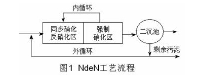 缺氧與反硝化是聯系緊密的兩個概念。缺氧是指混合液中只存在化合態氧(NO-X)而不存在分子態氧的一種狀態。當既無NO-X又無DO時,則為厭氧狀態。在缺氧狀態下,NO-X是唯一的最終電子受體。如果存在可利用的碳源,則微生物必然進行反硝化。但此時如果存在溶解氧,微生物將優先利用O2作為最終電子,從而抑制反硝化。因此,在實際污水處理中,N2O工藝一般要求缺氧段的DO<0.5mg/l。但近年來發現DO>0.5mg/l時,缺氧段也能繼續保持反硝化。同時,由于DO的提高,硝化也同時存在。由此人們認識到,硝化和反硝化可以在某個較高的DO范圍(如10~15mg/l)內同步進行。對同步硝化和反硝化現象可能的解釋是:活性污泥中的硝化細菌易于脫離污泥絮體而游離存在,或主要生存在絮體的外層,而進行反硝化的異氧菌則主要集中在絮體內部。當控制DO在合適的范圍時,混合液主體以及污泥絮體外層處于好氧狀態,硝化細菌進行硝化,而污泥絮體內部處于缺氧狀態,異氧菌進行反硝化。基于同步硝化反硝化的工藝有:NdeN工藝、Orbalsim Pre工藝和OAO工藝。NdeN是美國Enviro公司的專利工藝,流程如圖1。