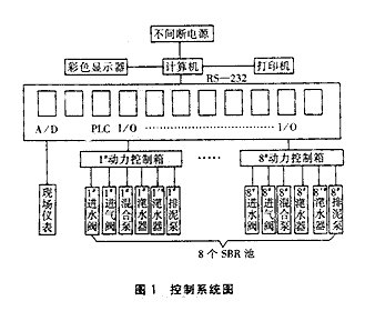 SBR自動控制系統由監控管理計算機(上位機)、可編程序控制器(PLC)、電氣控制柜、現場執行機構及現場監測儀表組成。控制系統如圖1。