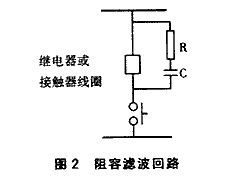 在SBR控制系統中,由于現場電氣設備較多,而且PLC的I/O信號均由繼電器的無源觸點給出,大量的繼電器被用于控制系統中,加上現場條件較差,靈敏度較高(吸合電壓較低)的繼電器本身受到線路布線的影響而產生誤動作。為此,考慮在繼電器線圈兩端并聯RC吸收回路(如圖2),其中電阻值可在100~1 000 Ω之間,電容在0.03~1 μF之間選用,但須注意電阻的阻值和電容耐壓要有余量。實踐證明這是一種簡單有效的方法。