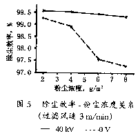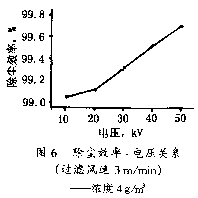 1. 電壓值為40kV和0V,過濾風速為1,2,3,4,5,6m/min,人口粉塵濃度為2,4,6,8g/m3;