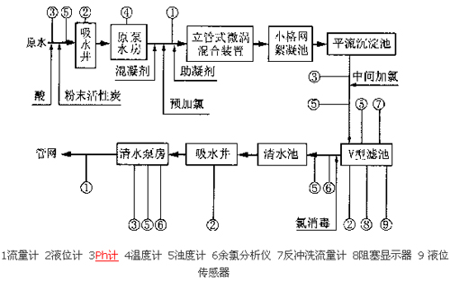 4.檢測儀表為了即時控制和檢測水廠生產過程中的參數,在工藝流程中不同的部位安裝了各種檢測儀表,分別安裝了pH分析儀、濁度計、流量計、液位計、液位傳感器、阻塞顯示器、余氯泄漏探測器、余氯分析儀等檢測儀表。檢測儀表均為進口設備。