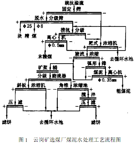 云崗礦選煤廠是設計處理能力400萬t/a的礦井型選煤廠,采用跳汰主洗工藝,大于13mm級塊煤入洗,煤泥壓濾回收,洗水閉路循環,1997年12月投產。隨著礦井對深層煤炭的開采及煤炭市場的變化,原煤質量變差,灰分、硫分增高,小于13mm級篩分末煤不能滿足用戶對煤質的要求。為此,從1998年10月到1999年5月,選煤廠完成了降低入洗下限至8mm的系統工藝改造,運行一年半的時間效果不明顯。為改善精煤質量,建立出口煤基地,從2000年3月開始,進行全級泥煤入洗系統工藝改造,同年10月竣工投產。經生產實踐驗證,受煤泥水處理工藝的影響,在生產量不足設計能力的情況下,循環水濃度持續升高,平均在200g/L左右,有時高達300g/L以上,整個生產過程在高濃度煤泥水環境下作業,致使工藝指標下降,生產環境惡化。盡管絮凝劑用量很大,但對循環水濃度改變甚微。循環水濃度持續升高成為制約本廠生產的主要問題。