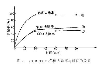 3COD、TOC、色度去除率與時間的關系(見圖2)