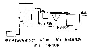 首先用石灰乳將廢水pH值中和至6.5~8,然后加入PAFC(聚合氯化鋁鐵),絮凝沉淀0.5h(COD去除率為20%~30%)后上清液進入HCR。HCR出水經脫氣池(主要脫去附著在活性污泥表面的CO2、空氣等)脫氣后進入沉淀池進行泥水分離,HCR可去除70%~80%的COD。沉淀池出水經接觸氧化池處理后出水達到進入城市管網的排放要求。