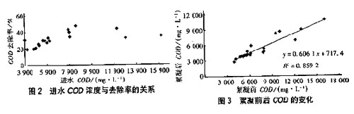 試驗把PAFC作為絮凝劑,進水COD濃度對其去除率的影響及絮凝前后COD的變化分別 見圖2、3。由圖2知,絮凝對COD的去除率相對穩定,其值穩定在25%~35%。絮凝前后的COD濃度相關直線斜率為0.6,相關系數>0.9(圖3)。