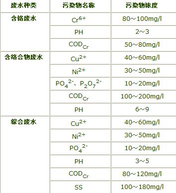 廢水經處理后達到需達到《國家綜合污水排放標準》(GB8978-1996)之一級標準。即Cr6+≤0.5mg/l,Cu2+≤0.5mg/l,Ni2+≤1.0mg/l,PO42-(以P計)≤1.0mg/l,CODCr≤100mg/l,SS≤70mg/l