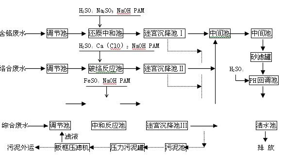 含鉻廢水,絡合廢水,綜合廢水分別進入各自的調節池均質。