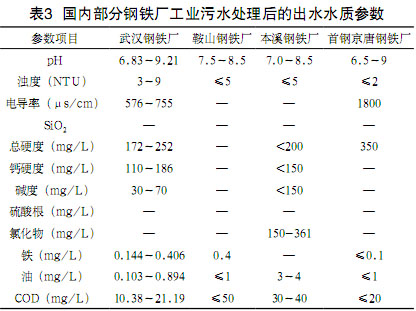 表3列舉了國內幾個鋼廠工業污水經過常規處理后出水的主要水質參數。