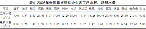 表4為2006年全國重點鋼鐵企業各工序水耗、耗新水量情況表。從中可以看出連鑄(屬于煉鋼)和熱軋也為耗水量大戶,同時也是排污大戶,如果長期不把連鑄、熱軋所排污水納入工業污水深度脫鹽處理系統,將會成為工業污水回用的一大瓶頸,影響工業水系統的節能減排。