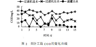 工程運行中主要考察了盤式過濾機的進水.出水和固定化生物活性炭濾罐出水的COD變化,結果見2圖,在經過了運行初期的適應階段后,各處理單元的出水COD趨于穩定。經盤式過濾機和固定化濾罐COD由40mg/L左右降至12 mg/以下,去除率在70%以上,其出水能夠滿足進入脫鹽系統的要求。
