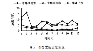 盤式過濾機的進出水和固定化濾罐出水的濁度變化見圖3.從圖3可以看出,廢水在經過盤式過濾機后,濁度已達到設計要求,而固定化濾罐又將此濁度去除70%以上,這也進一步說明人工固定化生物活性炭既有降解有機物的功能,又有較強的吸附和過濾能力。