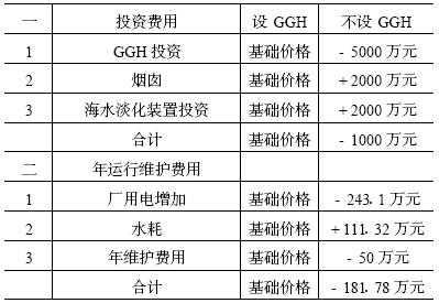 綜合上述數據, 脫硫裝置不設GGH 方案可節省投資約1000 萬元; 如果不考慮分攤海水淡化裝置的初投2000 萬元, 則可節省投資約3000 萬元。