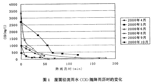 通過對北京部分屋面雨水水質分析測定,發現屋面徑流污染也比較嚴重。這里僅以COD隨降雨歷時的變化規律為例。