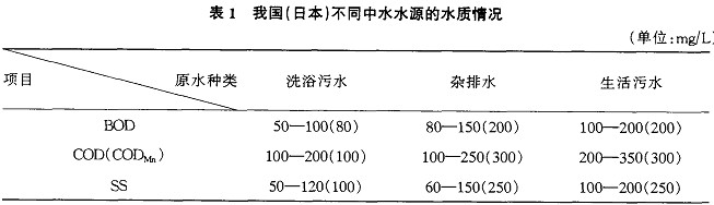 3屋面雨水用作中水補充水源與建筑中水系統聯合運行存在問題分析3.1中水水源水質分析對住宅小區而言,中水水源一般可分為生活污水、雜排水(除沖廁之外的其它生活污水J、洗浴發水三種,其水質逐次漸好:目前實際工程中中水源主要是后兩種水源。對以大型公共建筑為主{本的城市建筑小區設置中水系統,可優先采用集中的洗浴污水做水源:我國及日本不同中水水源的水質情況詳見表l:3.2現行中水系統運行情況分析