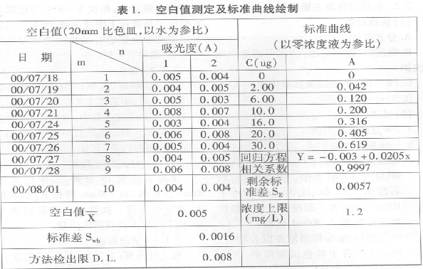 分取0.O,1.00,3.oo,5.00,8.00,10.00,15.00ml磷酸鹽標準使用液于消解罐中,按2.3.1--2.3.3步驟操作,得一標準曲線如下表,空白試驗每日做兩個平行,累積10天數據如下表。