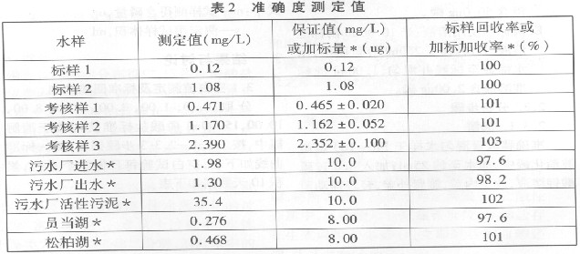為了檢驗微波消解法的準確度,分別取環境臨測總站考核樣、磷酸二氫鉀標準深液,污水廠各工藝段水樣以及湖泊水樣進行實驗,結果見表2。