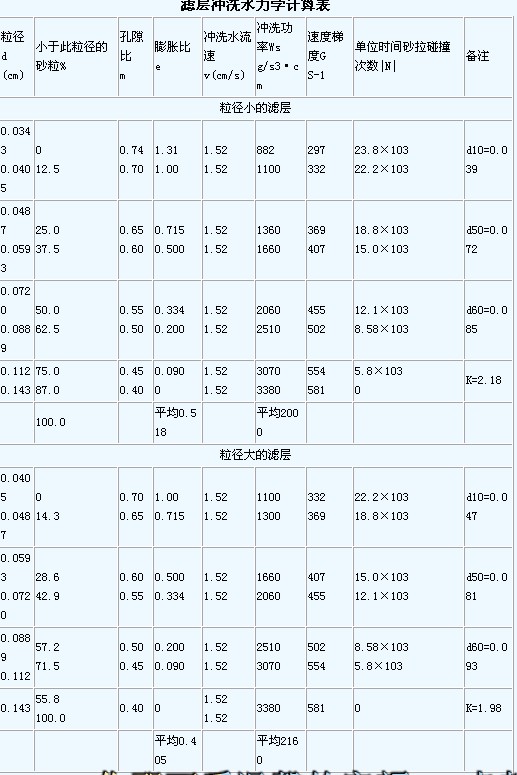 從下表可見,粒徑小的濾層,最佳膨脹率為51.8%。粒徑大的濾層,最佳膨脹率為40.5%。砂層組成決定最佳膨脹率大于、等于或小于50%。使最小粒徑砂層孔隙比達到0.74有決定性意義,建議設計濾池沖池強度以此為準。