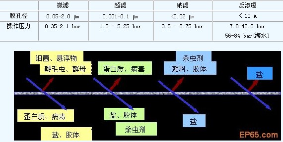 上圖顯示了水中各種雜質的大小和去除它們所使用的分離方法。反滲透主要用來去除水中溶解的無機鹽;而超濾則可以去除病毒、大分子物質、膠體等;微濾一般能夠去除水中的細菌、灰塵,具有很好的除濁效果。這些都是傳統的過濾(如砂濾、多介質過濾等)無法實現的。