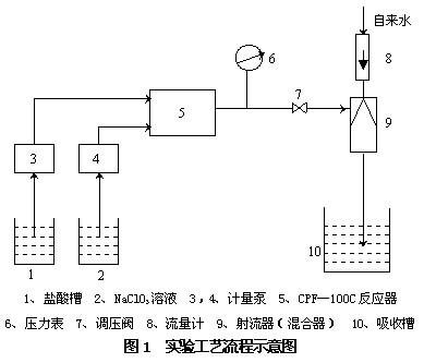 正壓式二氧化氯發生器是近兩年才開發出的主要用于深井泵后、自來水管網、油井注水管道等在線帶壓加藥的新型消毒設備。采用NaClO3+HCl反應工藝的正壓式ClO2發生器其化學法反應過程中產生ClO2和Cl2氣體。從化學平衡理論上分析壓力的增加會抑制這兩種氣體的生成,從而降低ClO2的產量,影響消毒效果。為了驗證實際情況是否如此,本實驗采用國內具有一定代表性的正壓式ClO2發生器的核心部件“華浦CPF-100C型反應器”進行加壓試驗,并取得一定結果,希望該試驗結果能對正壓式ClO2發生器的使用者和生產者有一定的參考價值。