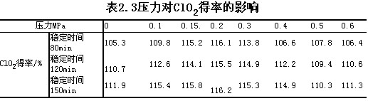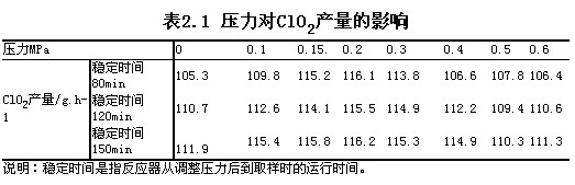 在正壓反應器CPF-100C上按1.1.3節的方法測定了在不同壓力下ClO2的產量,結果如表2.1所示。圖中也列出了同一壓力序列下不同穩定時間的值。