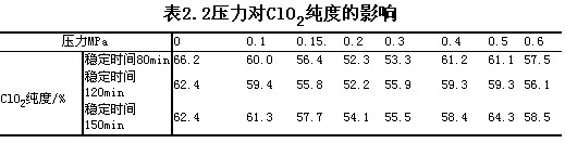 表2.2可知,在實驗條件下,ClO2的純度在52.2~66.2%之間變化,平均值為58.5%,從數據上看壓力的增加,沒有明顯改變ClO2的純度。不同穩定時間下測定的純度平均值分別為80min 58.5%,120min 57.8%,150min 59.2%,與理論值63.35%相差最大值為5.6%,與負壓反應結果58.3%相當。