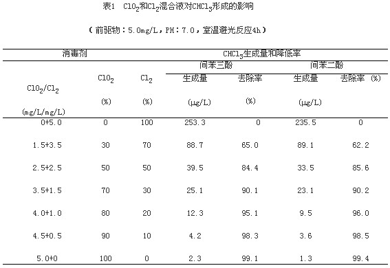 由表1可見,ClO2和Cl2混合液與間苯三酚、間苯二酚反應,隨著ClO2在混合消毒劑中所占比例的增加,CHCl3生成量才有較大幅度的降低,但ClO2含量在70%以前,CHCl3生成量降低十分明顯,ClO2含量達90%時CHCl3可達98%去除率,即基本控制了CHCl3生成。岳舜琳[1]考察了ClO2和Cl2混合投加對自來水中總三鹵甲烷TTHMs產生的影響,發現混合消毒劑中ClO2含量為70%時,對TTHMs的去除率為93%,ClO2含量為85%時,TTHMs去除率為100%。