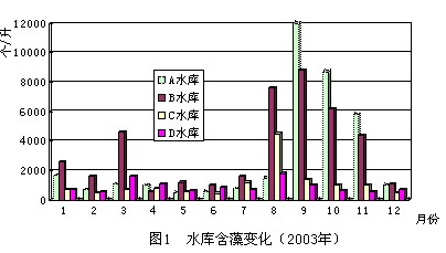 深圳市主要水源水庫水質具有高藻、低濁特點,圖1顯示了深圳市4個主要水庫2003年藻類變化情況。由圖1可見,藻類年平均值均在107個/L以上,含藻量變化的季節行特征較為明顯。7月—11月份藻類達到最高值。盡管水廠現有的常規處理工藝對藻類有一定的去除效果,但出廠水中仍存在一定數量的殘余藻類,并有可能影響水的嗅味和色度,降低飲用水的化學和微生物安全性。《深圳市2010年生活飲用水水質目標》將藻類列為試行項目,要求飲用水中的藻類不得超過1.0*104個/升。去除藻類的方法,一是在藻類生成后采用物理及化學方法去除,二是在藻類生成前設法不讓其形成又優勢物種,這主要涉及水源的保護。水廠主要是對生成的藻類進行去除,由于采用物理及化學方法除藻會使藻細胞破裂,導致藻毒素釋放到水體中。ClO2對藻類具有很好的去除效果,但殺滅藻類釋放藻毒素的速率明顯高于ClO2氧化藻毒素的速率,對藻毒素的去除能力有限。因而水源水藻類含量高的地區選ClO2用于除藻,必須要考慮藻毒素的風險。