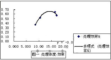 由圖可以得出,濃度變化時處理效率也相應的變動,由圖表可以得出方程:y=-0.0091×X2+0.261X-1.2062 由此可以積分知道最佳的濃度是14.5mg/l,此時的處理效率最高是66.5%。