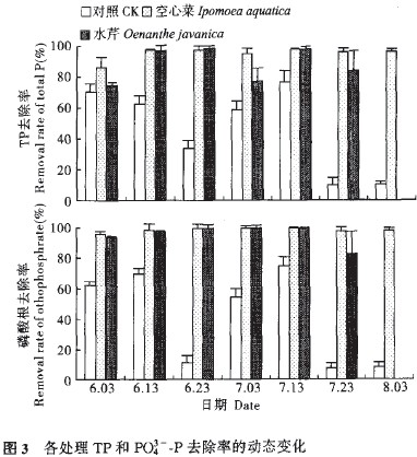 浮床系統對P的去除途徑包括植物吸收、沉淀、吸附作用和微生物固定等。浮床空心菜和水芹系統對TP去除率多數時候高達85%以上且穩定,而對照TP去除率有4個換水周期為60%左右,但有3個值卻小于10%。空白的較高值與徐曉峰試驗結果較為一致(圖3)。造成3個換水周期內TP去除率較低的可能原因是:在6月23日、7月23日和8月3日試驗期間,環境溫度較高,陽光充足,對照箱受到水綿污染,并生長迅速,水綿具有較大的表面積,能吸附水體中的P,并阻礙P的沉淀,取樣時為了不使水綿進入水樣,對水體擾動較大,造成水綿吸持的P又重新進入水體,最后導致結果偏低。這也從另一個方面說明沉淀和吸附作用在對照系統P去除中起著重要作用,而植物箱內水綿很少,植物吸收、P的沉淀和吸附共同作用導致系統具有較高的P去除率。植物吸收同化的P占系統所去除P的一半左右,說明植物的吸收作用在P的去除中起著重要作用(表4)。POf—P的去除情況類似于TP。