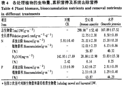 4.2植物組織所累積的N、P量分別占各自系統去除量的40.32%--63.87%。植物的吸收同化作用是N、P去除的主要途徑。