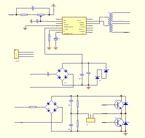 220V/50Hz 經兩個二極管整流橋對工頻電源進行整流,整流后其中一路用來驅動集成電路 3525 ,另一路經電解電容與電阻濾波后供給臭氧放電室的正極。集成電路 3525 的輸出作為升壓變壓器的輸入, 3525 的“ VREF ”管腳用來控制電位器以實現臭氧產量與濃度的平滑調節;變壓器的輸出經一個大功率三極管 IRF840 后供給臭氧放電室的地極,放電室的地極又通過一個大功率三極管 IRF840 接地起保護作用。系統主電路結構圖如下所示: