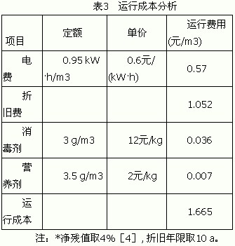 本工程污泥提升泵為氣提式,不消耗電能,也無污泥回流系統,能耗主要來自移送泵、自吸泵和鼓風機(兩套加藥系統計量泵裝機容量很小,在此忽略)。鼓風機裝機容量為1.5 kW,每天24 h運轉,移送泵和自吸泵的裝機容量分別為0.4 kW 和0.75 kW,每天運行時間按18 h計,則該中水回用系統單位能耗為0.945 kW·h/m3。由于膜組件公稱孔徑為0.4 μm,雖然最小的細菌尺寸在0.3 μm左右,但在MBR中細菌通常以菌膠團形式存在,無法透過膜孔,因此MBR出水細菌含量少,可減少消毒劑用量;另外本工程無須看管,省去了人工費。運行成本的具體分析見表3,合計運行成本為1.665元/ m3。
