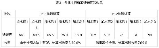 從表中可以看出,加水前隨著試驗的進行、濃縮倍數的提高,透析液的透光度逐漸降低;開始加水后,不斷的對料液進行洗脫、料液中有效成分的含量逐漸減少,透析液的透光度也逐漸提高。