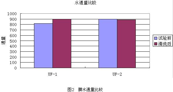 水通量的大小是考核膜清洗恢復情況的主要指標,試驗中分別測量并記錄了走料前的水通量、清洗后的水通量,得到圖2: