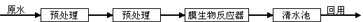 膜生物反應器(Membrane Biological Reactor,簡稱MBR)是將膜組件引入廢水處理氧化池中的一種新型污水處理技術。在MBR中,活性微生物與污水充分接觸氧化,不斷氧化污水中能被微生物降解的有機物,而不能被微生物降解的有機物和無機物及活性污泥、懸浮物、各類膠體、大部分細菌則被MBR中的膜組件截留,活性污泥濃度大大提高,實現了水力停留時間和泥齡的完全分離。MBR對于原水水質的的變化均有很強的適應性,保證出水水質的穩定,集生物反應器的生物降解作用和膜的高效分離作用于一體,大大強化了生物反應器的功能。MBR工藝流程見圖1。