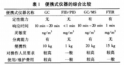 商用FFIR通常包括光學、機械、電子及電氣部分、樣品處理和分析系統。紅外吸收光譜圖以圖形形式表示出被樣品吸收的不同頻率范圍的紅外光譜。依照不同物質的紅外吸收光譜,對照光譜圖對物質定性;依照比爾定律對待測物質定量分析。 FFIR分析速度較快,響應時問較為理想,但由于其無分離能力,對復雜有機化合物的定性困難,同時容易受環境中水汽的影響,對待測物質的溫度也有一定的要求,對分析人員的經驗和能力也要求較高。 2揮發性有機物便攜式監測儀器性能比對便攜式儀器的綜合比較見表1。