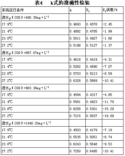 將4個進水COD的質量濃度:490.35,867.07,983.38和1440.20mg/L,依次代入冬季k與Yo的關系式k=-0.000 02 Yo+0.479 1,可估算出4個k,依次是:0.469 3,0.461 8,0.459 4和0.450 3 d-1。同理,將上述4個進水COD值代入夏季k與Yo的關系式k=0.000 3Yo+0.372 7,求出4個相應的k,依次是:0.519 8,0.632 8,0.721 5和0.725 0d-1。