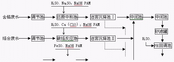 含鉻廢水,絡合廢水,綜合廢水分別進入各自的調節池均質。