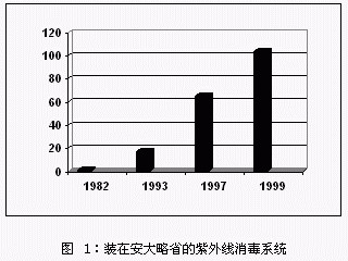 1984年美國環保署(US EPA)報道了52套紫外線消毒裝置,另外35個項目正在設計中,30個項目正在建造中。其中TILLSONBURG已經安裝使用了加拿大的設備,COLLINGWOOD作為一個建設項目。到1992年,紫外線污水消毒設備的數量已增加到424套(EPA,1992)。