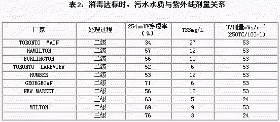 安大略省環境部MOE繼續試驗紫外線對廢水消毒的效果。1982年BOHM和HO對8家污水處理廠的二級和三級污水進行了研究(表2)。污水經過6只Teflon管子,這些管子由12只低壓燈和反射鏡包圍著,最大流量為190L/分鐘(50GPM US)。