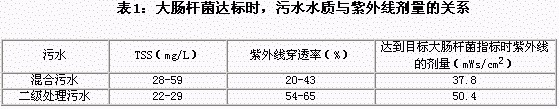 1984年HO和BOHM(1984)在RICHMOND HILL WPCP經過6個月的研究,繼續對紫外線消毒進行評估。二級處理污水經過常規的活性污泥法、加氯化鐵除磷再流經紫外線進行中試。通過增加導流板和分配管來改變16根燈的中試系統。紫外線劑量為25mWs/cm2 時,大腸桿菌的總數在200到500/100ml。劑量為50mWs/cm2時,大腸桿菌的減少沒有明顯提高。在實驗中采用二級處理污水和一級處理污水相混合來模擬一級混合污水的水質,二級污水中固體顆粒所含鐵的濃度較高,要達到大腸桿菌指標時,需要較高的紫外線劑量(表1)。鐵濃度對紫外線劑量的影響要高于一級混合污水中高TSS濃度的影響。實驗中每8小時手動清潔石英管壁。