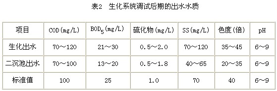 從調試初期的進、出水水質可以看出,盡管進水量較少,但由于好氧污泥尚未培養成熟,生物膜尚未掛好及進水中硫化物濃度較高,致使出水COD超標。