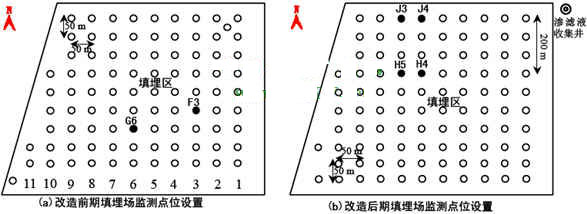 選擇2003年4月~7月連續監測,沿填埋區沼氣收集管選擇采樣監測點,分別為J3、J4、H4、H5,其中,J3、J4間距50m;J4、H4間距200m;滲濾液收集井處監測點位為填埋區東北側滲濾液收集井,點位布置圖如圖1(b)所示。