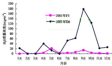 2001年選取填埋區F3、G6兩個垂直型沼氣排放管監測H2S氣體,排放管直接取氣分析。結果如圖3所示。