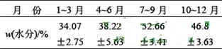 從圖3可知,G6排氣管H2S氣體排放濃度隨季度變化較為顯著,H2S氣體峰值出現在第3季度的9月。F3排氣管H2S氣體排放濃度變化平緩,平均為 5.48mg/m3。從圖2可知,由于G6地區2001年1~12月新鮮垃圾填入總高度為2m,1994~2000年填入速率約2m/a;而F3地區 2001年新鮮垃圾填入厚度為0.5m,此前幾年的填埋量也較為平均,但只有G6地區填入高度的1/4。從表1可以看出新鮮垃圾夏季和秋季的可農用部分占 26.84%,冬季和春季的可農用部分占32.13%;從表2可以看出陳垃圾的可農用季的可農部分僅占3.09%,因此F3地區H2S氣體變化較為平緩。新鮮垃圾可農用部分夏季、秋季小于冬季、春季,而H2S氣體變化在夏季和秋季最為顯著。這是由于我國北方地區垃圾組成受季節影響明顯,秋季、夏季蔬菜和水果消耗量大,尤其夏季主要以西瓜等含水率很高的有機垃圾為主;而冬季、春季垃圾的含水率相對較低。1996~2001年阿蘇衛填埋場新鮮生活垃圾含水率變化,如表3所示。