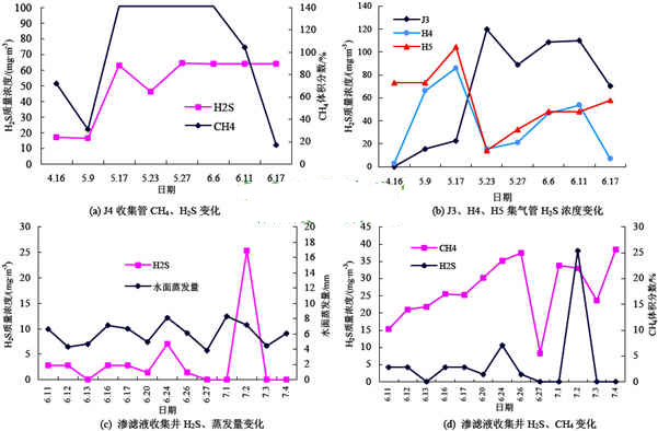 填埋區共選取J3、J4、H4、H5等4個垂直型沼氣收集管監測H2S氣體。H2S取氣口直接取氣分析;CH4采用采氣袋取氣,氣相色譜分析。