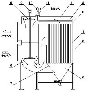 1上箱體 2噴吹管 3花板 4濾袋 5中箱體 6園盤閥 7擋風板 8灰斗 9驅動裝置 10脈沖閥 11穩壓氣包